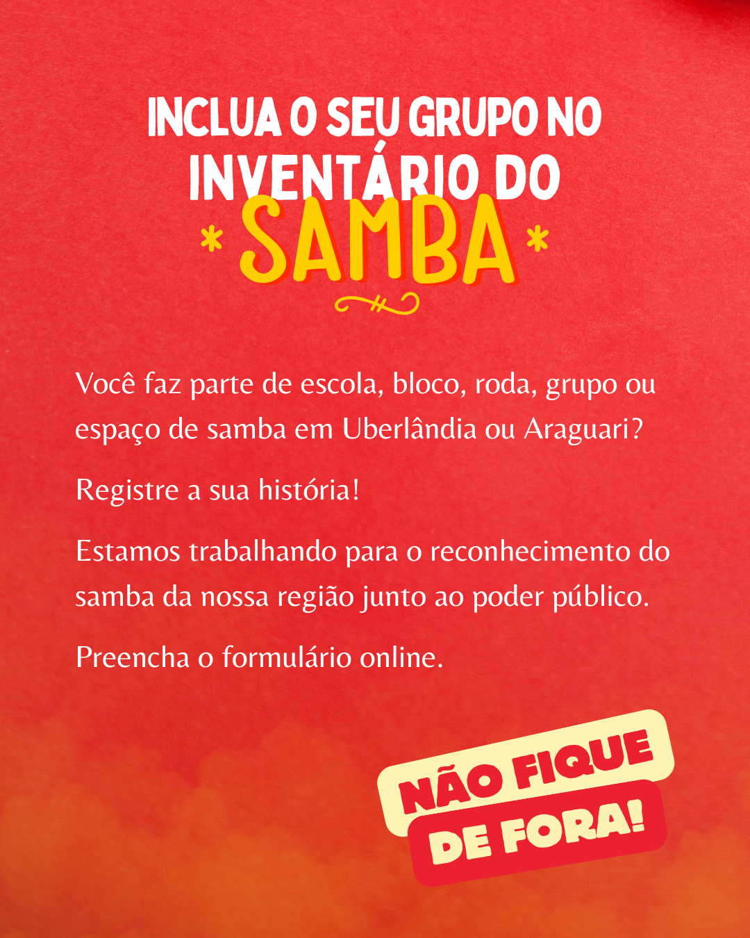 Vamos identificar os lugares, mestres, saberes e formas de expressão do samba nos municípios de Uberlândia e Araguari, na região do Triângulo Mineiro, utilizando a metodologia do Inventário Cultural Participativo — uma abordagem que reconhece a comunidade como autora e guardiã de sua própria história.